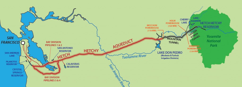We get our water from the Hetch Hetchy Reservoir. The pristine water travels to Crystal Springs, enters San Francisco, and is stored in large Reservoirs like University Mound.